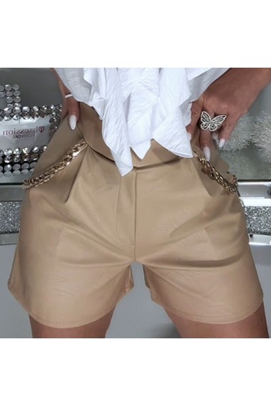 Postaw na efekt „wow”! Te beżowe spodenki z eko skóry to idealne połączenie klasy i drapieżnego stylu.Pięknie podkreślają talię, a złoty łańcuszek przy kieszeniach dodaje im luksusowego charakteru.